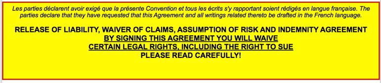 In consideration of THE RELEASEES allowing me to participate in Adventure Activities and permitting my use of their property, ziplines, platforms, bridges, trails, roads, ski lifts, gondolas, other structures and equipment (hereinafter referred to as the“ Facilities”), and for other good and valuable consideration, the receipt and sufficiency of which is acknowledged, I HEREBY IRREVOCABLY AGREE AS FOLLOWS : TO WAIVE ANY AND ALL CLAIMS that I have or may in the future have against THE RELEASEES and TO RELEASE THE RELEASEES from any and all liability for any loss, damage, expense or injury including death that I may suffer, or that my next of kin may suffer resulting from either my use of or my presence on the Facilities DUE TO ANY CAUSE WHATSOEVER, INCLUDING NEGLIGENCE AND FAULT, BREACH OF CONTRACT, NEGLIGENT MISREPRESENTATION OR BREACH OF ANY TYPES OF DUTIES , ON THE PART OF THE RELEASEES, AND ALSO INCLUDING THE FAILURE ON THE PART OF THE RELEASEES TO SAFEGUARD OR PROTECT ME FROM THE RISKS, DANGERS AND HAZARDS OF ADVENTURE ACTIVITIES REFERRED TO ABOVE; TO HOLD HARMLESS AND INDEMNIFY THE RELEASEES from any and all liability for any damage to property or personal injury of any nature to any third party, resulting from my use of or presence on the Facilities and my participation in the Adventure Activities; This Agreement shall be effective and binding upon my heirs, next of kin, executors, administrators, assigns and representatives, in the event of my death or incapacity; This Agreement and any rights, duties and obligations as between the parties to this Agreement shall be governed by and interpreted solely in accordance with the laws of the Province of Québec and no other jurisdiction; Any litigation involving the parties to this Agreement shall be brought solely within the Province of Québec and shall be within the exclusive jurisdiction of the Courts of the Judicial District of Montreal;. To consent to having photos or videos taken of me while participating in Adventure Activities and to the publication of the photos or videos by the Releasees for advertising, marketing and promotional purposes and I am waiving any right including any financial compensation in this regard. I AM NOT RELYING UPON ANY ORAL OR WRITTEN REPRESENTATIONS OR STATEMENTS MADE BY THE RELEASEES WITH RESPECT TO THE SAFETY OF THE ADVENTURE ACTIVITIES OTHER THAN WHAT IS SET FORTH IN THIS AGREEMENT. I CONFIRM THAT, PRIOR TO SIGNING THIS AGREEMENT, I HAVE READ AND UNDERSTAND THIS AGREEMENT , AND I AM AWARE THAT BY SIGNING THIS AGREEMENT I AM WAIVING CERTAIN LEGAL RIGHTS WHICH I OR MY HEIRS, NEXT OF KIN, LIQUIDATORS, ADMINISTRATORS, ASSIGNS AND REPRESENTATIVES MAY HAVE AGAINST THE RELEASEES. FOR AND ON BEHALF OF A PARTICIPANT OF MINORITY AGE, BY SIGNING WHERE INDICATED BELOW, I HEREBY CERTIFY THAT I AM THE PARENT/GUARDIAN WITH LEGAL RESPONSIBILITY FOR THIS PARTICIPANT OF MINORITY AGE AND I EXPLAINED TO THIS PARTICIPANT OF MINORITY AGE THE RISKS ASSOCIATED WITH HIS/HER PARTICIPATION IN THE SAID ACTIVITIES. I PERSONALLY ACKNOWLEDGE THE RISKS ASSOCIATED WITH THE PARTICIPATION BY THE PARTICIPANT IN THE ADVENTURE ACTIVITIES AND I HEREBY DO CONSENT AND AGREE TO HIS/HER RELEASE OF ALL THE RELEASEES, AND, FOR MYSELF, MY HEIRS, ASSIGNS, AND NEXT OF KIN, I RELEASE AND AGREE TO INDEMNIFY THE RELEASEES FROM ANY AND ALL LIABILITIES INCIDENT TO THIS PARTICIPANT OF MINORITY AGE’S PARTICIPATION IN THE ADVENTURE ACTIVITIES. This Release of liability, waiver of claims, assumption of risks and indemnity agreement was Signed this day of: December 26, 2025 THIS AGREEMENT MUST BE COMPLETED IN FULL, INITIALED, DATED AND SIGNED, AND WITNESSED PRIOR TO PARTICIPATING IN ANY ADVENTURE ACTIVITIES. |