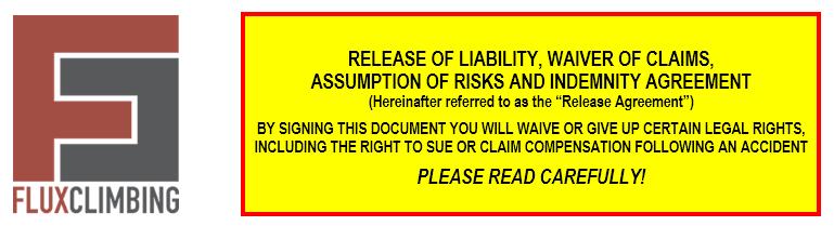 I am aware that Climbing Activities involve many risks, dangers, and hazards including but not limited to: serious personal injury; falls; cuts and abrasions; failure of climbing equipment including walls, flooring, climbing holds, training equipment, rentals, or any other equipment associated with or related to Climbing Activities; failure to climb or train safely within ones own abilities; infectious agents such as viruses, bacteria, parasites, and fungi which may be transmitted through direct or indirect contact; negligence on the part of other climbers or spectators; and NEGLIGENCE ON THE PART OF THE RELEASEES, INCLUDING THE FAILURE BY THE RELEASEES TO TAKE REASONABLE STEPS TO SAFEGUARD OR PROTECT ME FROM THE RISKS, DANGERS, AND HAZARDS OF CLIMBING ACTIVITES. I AM AWARE OF THE RISKS DANGERS, AND HAZARDS ASSOCIATED WITH CLIMBING ACTIVITIES AND I FREELY ACCEPT AND FULLY ASSUME ALL SUCH RISKS, DANGERS, AND HAZARDS AND THE POSSIBILITY OF PERSONAL INJURY, DEATH, PROPERTY DAMAGE OR LOSS RESULTING THEREFROM. RELEASE OF LIABILITY, WAIVER OF CLAIMS AND INDEMNITY AGREEMENT