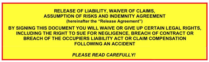 In this Release Agreement, the term "wilderness activities" shall include but is not limited to: alpine skiing, nordic skiing, telemark skiing, snowboarding, snowshoeing, hiking, touring, mountaineering, rock climbing, ice climbing, expeditions, trekking, glacier travel, and all activities, services and use of facilities either provided, arranged or organized by the Releasees including orientation and instructional sessions or classes, transportation, accommodation, food and beverage, and water supply, and all travel by or movement around helicopters, other aircraft, snowcats, snowmobiles or other vehicles and camping or overnight stays in the outdoors. In this Release Agreement, the term “Negligence” includes the failure by the Releasees to use such care as a reasonably prudent and careful mountain guide/instructor would use under similar circumstances, or breach of any other duty of care imposed by law. I AM AWARE OF THE RISKS, DANGERS AND HAZARDS ASSOCIATED WITH WILDERNESS ACTIVITIES AND I FREELY ACCEPT AND FULLY ASSUME ALL SUCH RISKS, DANGERS AND HAZARDS AND THE POSSIBILITY OF PERSONAL INJURY, DEATH, PROPERTY DAMAGE OR LOSS RESULTING THEREFROM. NOTICE TO SNOWBOARDERS AND TELEMARK SKIERS - INCREASED RISK