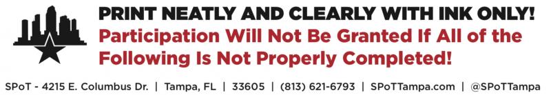 PARTICIPANT AGREEMENT, WAIVER OF SKATEPARK OF TAMPA (SPoT) LIABILITY, AND ASSUMPTION OF RISK BY YOU THE PARTICIPANT OR THE PARENT OR LEGAL GUARDIAN OF ANY MINOR PARTICIPANT: I hereby agree to waive any and all liability, indemnify, discharge and hold harmless Skatepark of Tampa, Inc.(SPoT), their owners, agents, staff, volunteers, participants on behalf of myself, my children, my parents, my heirs, assigns, personal representative, or estate and acknowledge the following: Skateboarding, in-line skating, BMX bicycling, scooters, and related activities herein defined as “Action Sports'' are inherently dangerous activities. Participation in action sports including mere presence or observing whether or not actually participating carries a serious risk of injury or even death. SPoT requires the use of a helmet for all action sports other than skateboarding. SPoT recommends use of helmets, pads and any other safety equipment appropriate for said activities. Failure to use safety equipment may increase your risk of injury. The risks include, but are not limited to: Collisions, my own equipment failure or the failure of others’ equipment; my own or others’ negligence; objects or conditions that may cause me to experience serious injury and even death. I expressly agree and promise to accept and assume all of the risks of this activity. My participation in this activity is purely voluntary, and I elect to participate with full knowledge of the risks and waiver of SPoT liability for those risks. 1. Florida Law creates substantial limitations on liability to encourage and promote the availability of Action Sports facilities and to further promote the many benefits of Action Sports activities. 2. SPoT hereby fully invokes any and all limitations of liability that may exist under current statutory law and Appellate Law Interpretation including but not limited to the specific legislative intent of Florida Statute 316.0085. 3. Any person who participates in or assists in skateboarding, inline skating, or freestyle or BMX bicycling assumes the known and unknown inherent risks in these activities irrespective of age, and is legally responsible for all damages, injury, or death to himself or herself or other persons or property which result from these activities. Any person who observes skateboarding, inline skating, paintball, or BMX bicycling assumes the known and unknown inherent risks in these activities irrespective of age, and is legally responsible for all damages, injury, or death to himself or herself which result from these activities. 4. While engaged in skateboarding, inline skating, freestyle or BMX bicycling, irrespective of where such activities occur, a participant is responsible for doing all of the following: (a) Acting within the limits of his or her ability and the purpose and design of the equipment used. (b) Maintaining control of his or her person and the equipment used. 5. Refraining from acting in any manner which may cause or contribute to death or injury to himself or others. 6. Failure to comply with the requirements of this paragraph shall constitute negligence by you the participant. I hereby voluntarily release, forever discharge, and agree to indemnify and hold harmless SPoT from any and all claims, demands, or causes of action, which are in any way connected with my participation in this activity or my use of SPoT's equipment or facilities, including any such claims which allege negligent acts or omissions of SPoT. IN THE EVENT LITIGATION ARISES OUT OF OR RELATING TO SPoT'S ENFORCEMENT OF THIS WAIVER, OR IF ANY LEGAL ACTION IS INITIATED BY YOU ARISING OUT OF OR RELATED TO THIS WAIVER, YOU AGREE THAT SPoT WILL BE ENTITLED TO RECOVER ITS REASONABLE ATTORNEYS' FEES, COSTS AND EXPENSES INCURRED IN INVESTIGATING, PREPARING FOR, PROSECUTING, DEFENDING AGAINST OR OTHERWISE LITIGATING ANY SUCH ACTION. I further certify that I am willing to assume the risk of any medical or physical condition I may have. In the event that I file a lawsuit against SPoT, I agree to do so solely in the state of Florida, County of Hillsborough in a court of competent jurisdiction. I further agree that the substantive law of the State of Florida shall apply in that action. I agree that if any portion of this agreement is found to be void or unenforceable, the remaining portions shall remain in full force and effect. I am signing this document and I acknowledge that if anyone is hurt or property is damaged upon entering SPoT or during my participation in this activity, I acknowledge my intention is to have waived my right to maintain a lawsuit against SPoT.Further, I may in fact owe to SPoT the reimbursement for Attorney Fees and costs incurred by SPoT. I have had sufficient opportunity to read this entire document. I have read and understood it, and I agree to be bound by its terms. By signing this document, I acknowledge that if I am hurt, anyone else is hurt, or property damage results as a result of my entering SPoT or during my participation in any activity, I may be found by a court of law to have waived my right to maintain a lawsuit against SPoT on the basis of any claim from which I have released them herein. I have had sufficient opportunity to read this entire document. I have read and understood it, and I agree to be bound by its terms. Today's Date: January 1, 2026 |