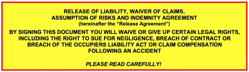 In consideration of the Releasees allowing me to participate in wilderness activities as defined in this Release Agreement, I hereby agree as follows: 1. TO WAIVE ANY AND ALL CLAIMS that I have or may in the future have against the Releasees and TO RELEASE THE RELEASEES from any and all liability for any loss, damage, expense or injury including death that I may suffer, or that my next of kin may suffer as a result of my participation in wilderness activities, DUE TO ANY CAUSE WHATSOEVER, INCLUDING NEGLIGENCE, BREACH OF CONTRACT, OR BREACH OF ANY STATUTORY OR OTHER DUTY OF CARE, INCLUDING ANY DUTY OF CARE OWED UNDER ANY APPLICABLE OCCUPIER’S LIABILITY LEGISLATION ON THE PART OF THE RELEASEES. I UNDERSTAND THAT NEGLIGENCE INCLUDES FAILURE ON THE PART OF THE RELEASEES TO TAKE REASONABLE STEPS TO SAFEGUARD OR PROTECT ME FROM OR WARN ME OF THE RISKS, DANGERS AND HAZARDS OF WILDERNESS ACTIVITIES REFERRED TO ABOVE; 2. TO HOLD HARMLESS AND INDEMNIFY THE RELEASEES from any and all liability for any property damage or personal injury to any third party resulting from my participation in wilderness activities; 3. This Release Agreement shall be effective and binding upon my heirs, next of kin, executors, administrators, assigns and representatives, in the event of my death or incapacity; 4. This Release Agreement and any rights, duties and obligations as between the parties to this Release Agreement shall be governed by and interpreted solely in accordance with the laws of the province where the wilderness activities take place and no other jurisdiction; and 5. Any litigation involving the parties to this Release Agreement shall be brought solely within the province where the wilderness activities take place and shall be within the exclusive jurisdiction of the Courts of that province. In entering into this Release Agreement I am not relying on any oral or written representations or statements made by the Releasees with respect to the safety of wilderness activities, other than what is set forth in this Release Agreement. I CONFIRM THAT I HAVE READ AND UNDERSTAND THIS RELEASE AGREEMENT PRIOR TO SIGNING IT, AND I AM AWARE THAT BY SIGNING THIS RELEASE AGREEMENT I AM WAIVING CERTAIN LEGAL RIGHTS WHICH I OR MY HEIRS, NEXT OF KIN, EXECUTORS, ADMINISTRATORS, ASSIGNS AND REPRESENTATIVES MAY HAVE AGAINST THE RELEASEES. Today's Date: January 22, 2026