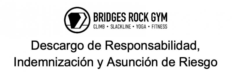 En consideración de que se le permita usar Bridges Rock Gym y/o cualquier otra instalación que sea propiedad o que sea operada por Interior Elevation, LLC o sus afiliadas (en conjunto, la “Compañía”), o participar en cualesquiera entrenamientos, programas, eventos o actividades de la Compañía, voluntariamente y con plena capacidad, celebro este acuerdo de descargo de responsabilidad, indemnización y asunción de riesgo (este “Acuerdo”). 1. REPRESENTACIONES Y GARANTÍAS. He leído cuidadosamente la siguiente lista, y declaro y garantizo que: a. Entiendo y reconozco que los entrenamientos, programas y eventos realizados por la Compañía, ya sea en Bridges Rock Gym o en cualquier otro lugar, pueden exponerme a riesgos inherentes, tanto previsibles como imprevisibles, incluyendo accidentes, lesiones, enfermedades o incluso la muerte.