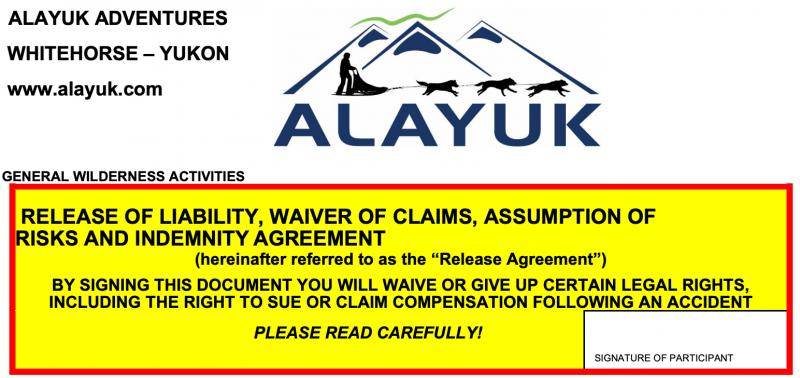In consideration of the RELEASEES agreeing to my participation in the Wilderness Activities and permitting my use of their services, equipment and other facilities, and for other good and valuable consideration, the receipt and sufficiency of which is acknowledged, I hereby agree as follows: 1. TO WAIVE ANY AND ALL CLAIMS that I have or may in the future have against the RELEASEES AND TORELEASE THE RELEASEES from any and all liability for any loss, damage, expense or injury, including death, that I may suffer or that my next of kin may suffer, as a result of my participation in the Wilderness Activities, DUE TO ANY CAUSE WHATSOEVER, INCLUDING NEGLIGENCE, BREACH OF CONTRACT, OR BREACH OF ANY STATUTORY OR OTHER DUTY OF CARE, INCLUDING ANY DUTY OF CARE OWED UNDER THE OCCUPIERS LIABILITY ACT, ON THE PART OF THE RELEASEES, AND FURTHER INCLUDING THE FAILURE ON THE PART OF THE RELEASEES TO SAFEGUARD OR PROTECT ME FROM THE RISKS, DANGERS AND HAZARDS OF PARTICIPATING IN THE WILDERNESS ACTIVITIES REFERRED TOABOVE; 2. TO HOLD HARMLESS AND INDEMNIFY THE RELEASEES for any and all liability for any property damage, loss or personal injury to any third party resulting from my participation in the Wilderness Activities; 3. This Release Agreement shall be effective and binding upon my heirs, next of kin, executors, administrators, assigns and representatives, in the event of my death or incapacity; 4. This Release Agreement and any rights, duties and obligations as between the parties to this Release Agreement shall be governed by and interpreted solely in accordance with the laws of the Yukon Territory where the Wilderness Activities take place and no other jurisdiction; and 5. Any litigation involving the parties to this Release Agreement shall be brought solely within the Yukon Territory where the Wilderness Activities take place and shall be within the exclusive jurisdiction of the Courts of that territory.. 6. In entering into this Release Agreement I am not relying on any oral or written representations or statements made by the Releasees with respect to the safety of participating in the Wilderness Activities, other than what is set forth in this Release Agreement. 7. To indemnify the Releasees for the Search and Rescues costs. I CONFIRM THAT I HAVE READ AND UNDERSTOOD THIS RELEASE AGREEMENT PRIOR TO SIGNING IT, AND I AM AWARE THAT BY SIGNING THIS RELEASE AGREEMENT I AM WAIVING CERTAIN LEGAL RIGHTS WHICH I OR MY HEIRS, NEXT OF KIN, EXECUTORS, ADMINISTRATORS, ASSIGNS AND REPRESENTATIVES MAY HAVE AGAINST THE RELEASEES. Today's date: December 21, 2025 |