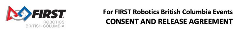 The Participant identified above (“Participant”) desires to participate (as a team member, coach, mentor, judge, or in some other manner) in the FIRST® Robotics Competition, FIRST Tech Challenge, FIRST LEGO® League, or another FIRST program (the “Programs”) in British Columbia. As a condition of allowing Participant to participate in a Program in British Columbia, FIRST Robotics British Columbia (“FIRST BC”) requires that the Participant (by his or her Parent/Guardian if under 19 years of age) agree to the terms of this Consent and Release Agreement (the “Agreement”). 1. Assumption of Risk: (A) Participant (and the Parent/Guardian of a Participant under 19 years of age) understands and acknowledges that while particular rules, equipment and personal discipline may reduce the risks outlined below, participation in the Program will expose Participant to risks of injury and illness including, without limitation, injury and illness resulting from: building, lifting, and using electrical/mechanical robots and robot components; using tools; other participants; dancing, physical activities; COVID-19* (see below) and other infectious diseases; and other associated activities. Participant (and the Parent/Guardian of a Participant under 19 years of age) understands that FIRST Robotics British Columbia does not select, employ, supervise or otherwise exercise authority or control over the coaches, mentors, and other participants in the Program. Participant, if 19 years of age or older, acknowledges and agrees that he/she is primarily responsible for his/her safety. The Parent/Guardian of a Participant under 19 years of age acknowledges and agrees that the Parent/Guardian is primarily responsible for the Participant’s safety and that the Parent/Guardian will monitor, as appropriate considering the age of the Participant and other factors, the Participant’s participation in the Program. (B) COVID-19. Participant (or Parent/Guardian of a Participant under 19 years of age) understands and agrees that participation in the Program presents certain risks and dangers to Participant, both serious and minor, arising from being exposed to the COVID-19 virus. COVID-19 is a disease caused by the virus SARS-CoV-2, declared by the World Health Organization to be a global pandemic. Participant (or the Parent/Guardian of a Participant under 19 years of age) understands that COVID-19 is considered highly contagious and is primarily spread from person-to-person, including by asymptomatic persons. COVID-19 is more likely to spread when people are in close proximity to one another. Participant (or the Parent/Guardian of a Participant under 19 years of age) understands that, while participating in a FIRST Program, Participant will be in close proximity to other persons, some of whom may be infected by, and able to spread, COVID-19. Participant (or Parent/Guardian of a Participant under 19 years of age) understands and acknowledges that, given the unknown nature of COVID-19, it is not possible to fully list each and every risk of contracting COVID19. Nevertheless, some of the generally understood risks include health consequences, personal injury, illness, permanent disability and even death, and may include coughing, shortness of breath, difficulty breathing, fever, chills, shaking, muscle pain, headache, sore throat, loss of taste or smell, pain or pressure in the chest, confusion, upper respiratory distress syndrome, pediatric multisystem inflammatory syndrome, and other symptoms and risks (“COVID-19 Exposure”). Participant (or the Parent/Guardian of a Participant under 19 years of age) understands and appreciates that COVID-19 risks are inherent in participating in a FIRST Program and that Participant may contract COVID-19 as a result of participating in a FIRST Program. Participant (or the Parent/Guardian of a Participant under 19 years of age) agrees that Participant’s participation in a FIRST Program is voluntary and Participant and the Parent/Guardian of a Participant under 19 years of age hereby knowingly assume the risk of any and all COVID19 Exposure. Participant (or the Parent/Guardian of a Participant under 19 years of age) understands and agrees that the waiver and release of the right to make injury claims stated below waives and releases the right to make any and all claims whatsoever related to COVID-19 Exposure and any and all claims for any resulting injury, disability, or illness up to and including death. 2. COVID-19 Symptom-Free Participation: Participant (or the Parent/Guardian of a Participant under 19 years of age) agrees that Participant will not participate in-person in a FIRST Program if Participant or any individual residing in the same home as Participant has had any symptoms of COVID-19 during the 14 days preceding the date of participation. Participant (or the Parent/Guardian of a Participant under 19 years of age) agrees that Participant will comply with any COVID-19 screening or exposure control practices which may be adopted by FIRST Robotics British Columbia when participating in a FIRST Robotics British Columbia Program and will also comply with any COVID19 requirements of the state or local jurisdiction in which the Participant is participating. 3. Release of All Claims In consideration for FIRST Robotics British Columbia allowing the Participant to participate in a Program, Participant (and the Parent/Guardian of a Participant under 19 years of age) assumes risk of such participation and hereby releases, waives and holds harmless FIRST Robotics British Columbia and all of FIRST Robotics British Columbia’s directors, officers, employees, volunteers, and agents from any and all claims with respect to any and all accident, illness, injury, disease of any kind of/to the Participant (and the Parent/Guardian), including without limitation, COVID-19 as described above, disability, death or loss or other damages to person or property that may occur as a result o