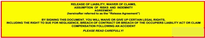 I am aware that ski racing and training involve many risks, dangers and hazards including, but not limited to: boarding, riding and disembarking ski lifts; changing weather conditions; avalanches; exposed rock, earth, ice, and other natural objects; trees, tree wells, tree stumps and forest deadfall; the condition of snow or ice on or beneath the surface; variations in the terrain which may create blind spots or areas of reduced visibility; variations in the surface or sub-surface, including changes due to man-made or artificial snow; variable and difficult conditions; streams, creeks, and exposed holes in the snow pack above streams or creeks; cliffs; crevasses; snowcat roads, road-banks or cut-banks; collision with lift towers, fences, snow making equipment, snow grooming equipment, snow grooming, snowmobiles or other vehicles, equipment or structures; encounters with domestic and wild animals including dogs and bears; collision with other persons; loss of balance or control; slips, trips and falls; accidents during snow school lessons; infectious disease contracted through viruses, bacteria, parasites, and fungi which may be transmitted through direct or indirect contact; negligent first aid; failure to act safely or within one's own ability or to stay within designated areas; negligence of other persons; and NEGLIGENCE ON THE PART OF THE RELEASEES. I UNDERSTAND THAT NEGLIGENCE INCLUDES FAILURE ON THE PART OF THE RELEASEES TO TAKE REASONABLE STEPS TO SAFEGUARD OR PROTECT ME FROM OR WARN ME OF THE RISKS, DANGERS ANO HAZARDS REFERRED TO ABOVE. I am also aware that the risks, dangers and hazards referred to above exist throughout and beyond the ski area and that many hazards are unmarked. I FREELY ACCEPT AND FULLY ASSUME ALL SUCH RISKS, DANGERS AND HAZARDS AND THE POSSIBILITY OF PERSONAL INJURY, DEATH, OR PROPERTY DAMAGE OR LOSS RESULTING THEREFROM. RELEASE OF LIABILITY, WAIVER OF CLAIMS AND INDEMNITY AGREEMENT
