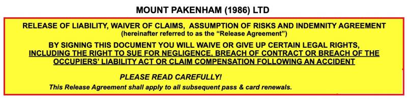2025-2026 Mount Pakenham Release of Liability TO: MOUNT PAKENHAM (1986) LTD and its directors, officers, employees, instructors, agents, representatives, volunteers, independent contractors, subcontractors, successors and assigns (hereinafter collectively referred to as the “Releasees”). SECTION 1: ACKNOWLEDGEMENT OF RISKS – PLEASE READ CAREFULLY! I am aware that skiing, snowboarding and participating in snow school lessons, clinics and sessions (collectively referred to as the “Activity”) involve many risks, dangers and hazards including, but not limited to: boarding, riding and disembarking ski lifts; changing weather conditions; avalanches; exposed rock, earth, ice, and other natural objects; trees, tree wells, tree stumps and forest deadfall; the condition of snow or ice on or beneath the surface; negligent first aid; failure to act safely or within one’s own ability or to stay within designated areas; negligence of other persons; and RISKS RESULTING FROM THE NEGLIGENCE, BREACH OF CONTRACT, OR BREACH OF ANY STATUTORY DUTY OF CARE ON THE PART OF THE RELEASEES. I UNDERSTAND THAT NEGLIGENCE INCLUDES FAILURE ON THE PART OF THE RELEASEES TO TAKE REASONABLE STEPS TO SAFEGUARD OR PROTECT ME FROM, OR WARN ME OF, THE RISKS, DANGERS AND HAZARDS. I also understand that other risks include variations in the terrain which may create blind spots or areas of reduced visibility; variations in the surface or sub-surface, including changes due to man-made or artificial snow; variable and difficult conditions; streams, creeks, and exposed holes in the snow pack above streams or creeks; cliffs; crevasses; snowcat roads, road-banks or cut-banks; collision with lift towers, fences, snow making equipment, snow grooming equipment, snowcats, snowmobiles or other vehicles, equipment or structures; encounters with domestic and wild animals including dogs and bears; exposure to INFECTIOUS DISEASE CONTRACTED THROUGH VIRUSES, BACTERIA, PARASITES, AND FUNGI WHICH MAY BE TRANSMITTED THROUGH DIRECT OR INDIRECT CONTACT; collision with other persons; loss of balance or control; slips, trips and falls; and accidents during participation in the Activity. I am also aware that the risks, dangers and hazards referred to above exist throughout and beyond the ski area and that many hazards are unmarked. SECTION 2: ASSUMPTION OF RISKS – PLEASE READ CAREFULLY! I FREELY ACCEPT AND FULLY ASSUME ALL THE RISKS, HAZARDS, AND DANGERS AND THE POSSIBILITY OF PERSONAL INJURY, DEATH, OR PROPERTY DAMAGE (AS SET OUT IN SECTION 1) WHILE ENGAGED IN OR AS A RESULT OF MY VOLUNTARY PARTICIPATION IN THE ACTIVITY SECTION 3: RELEASE OF LIABILITY, WAIVER OF CLAIMS AND INDEMNITY AGREEMENT. THESE CONDITIONS WILL AFFECT YOUR LEGAL RIGHTS – PLEASE READ CAREFULLY! IN CONSIDERATION OF the Releasees accepting my application for a Ski/Snowboard/Snowshoe/Snow Tubing Pass and permitting my use of the lifts, ski runs, trails, terrain parks, race courses, restaurants, day lodge, parking, access roads and other ski area facilities (hereinafter “the premises”), I hereby agree as follows: 1. I AM GIVING UP CERTAIN LEGAL RIGHTS, INCLUDING THE RIGHT TO SUE, that arise or result from in whole or in part, participating in the Activity and, without limitation, claims arising out of or resulting from THE NEGLIGENCE, BREACH OF CONTRACT, BREACH OF ANY DUTY OF CARE OWED BY THE RELEASEES UNDER THE OCCUPIERS’ LIABILITY ACT; 2. WAIVE ANY AND ALL CLAIMS THAT I HAVE OR MAY HAVE IN THE FUTURE against the Releasees; 3. RELEASE THE RELEASEES FROM ANY AND ALL LIABILITY FOR ANY LOSS, DAMAGE, EXPENSE, AND INJURY AND DEATH, INCLUDING ANY CLAIM FOR CONTRIBUTION AND INDEMNITY, that I may suffer from my participation in the Activity DUE TO ANY CAUSE WHATSOEVER, INCLUDING NEGLIGENCE, BREACH OF CONTRACT AND ANY DUTY OF CARE OWED TO ME BY THE RELEASEES UNDER THE OCCUPIERS’ LIABILITY ACT. I UNDERSTAND THAT NEGLIGENCE INCLUDES THE FAILURE ON PART OF THE RELEASEES TO TAKE REASONABLE STEPS TO SAFEGUARD OR PROTECT ME FROM OR WARN ME OF THE RISKS, DANGERS AND HAZARDS REFERRED TO ABOVE; and 4. INDEMNIFY AND HOLD HARMLESS the Releasees from any and all liability, including claims for contribution and indemnity, for any damage to property of or personal injury to, any third party, resulting from my, or my family member or next of kins, use of the Releasees’ property or participation in the Activity. 1. AGREEMENT BINDING - This Release Agreement shall be effective and binding upon my heirs, next of kin, executors, administrators, assigns and representatives, in the event of my death or incapacity; 2. JURISDICTION - This Release Agreement and any rights, duties and obligations as between the parties to this Release Agreement shall be governed by and interpreted solely in accordance with the laws of Ontario and no other jurisdiction. Any litigation involving the parties to this Release Agreement shall be brought solely within Ontario, and shall be within the exclusive jurisdiction of the Courts of Ontario; and 3. SEVERABILITY - If any provision of this Agreement is determined by a court of competent jurisdiction to be invalid, illegal or unenforceable in any respect, such determination shall not impair or affect the validity, legality or enforceability of the remaining provisions hereof, and each provision is hereby declared to be separate, severable and distinct. In entering into this Release Agreement, I am not relying upon any oral or written representations or statements made by the Releasees with respect to the safety of skiing or snowboarding other than what is set forth in this Agreement. Photo/Video/DVD Release: I give permission for the free use of my image in any photographs, videos or DVD’s used for marketing or promotional purposes by Mount Pakenham. CONCUSSION AWARENESS (ROWAN'S LAW)